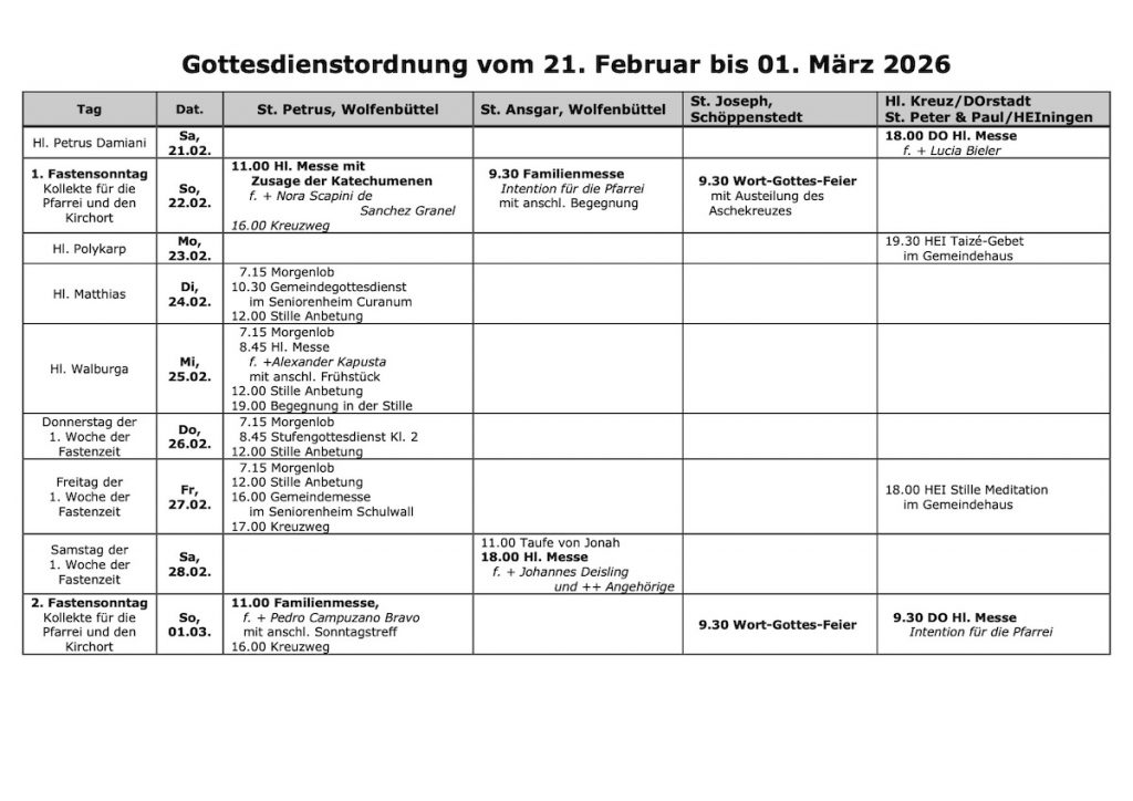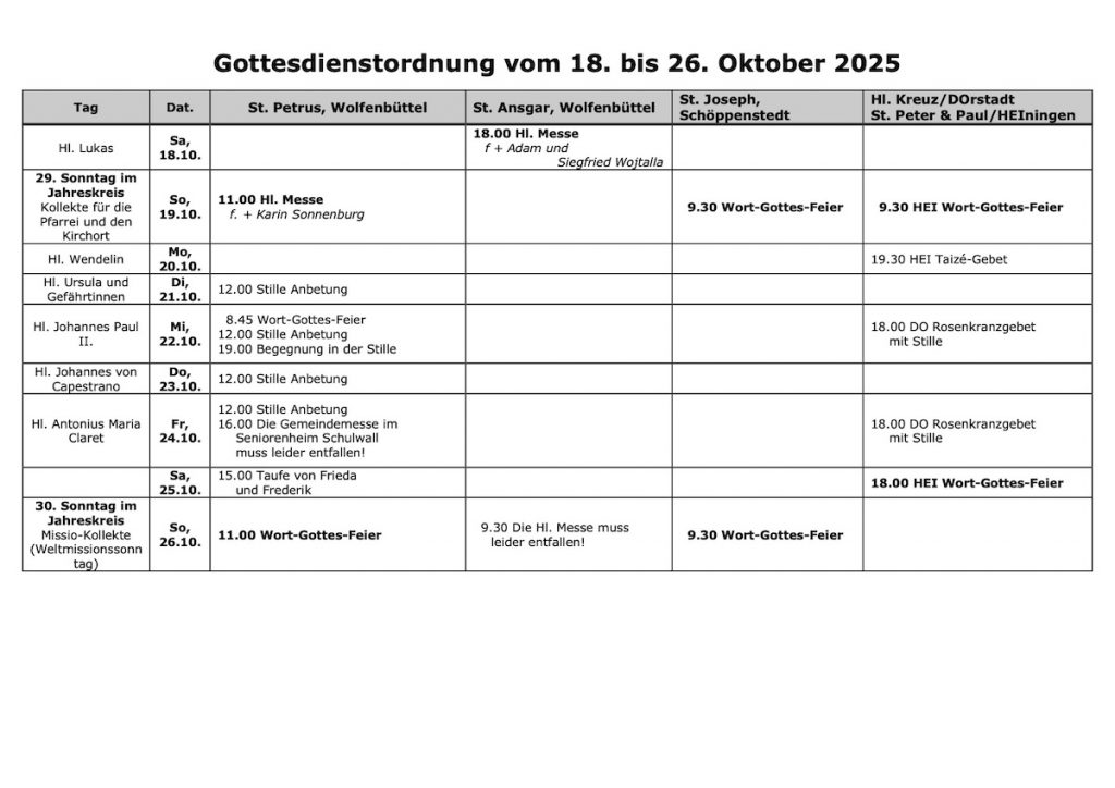 Aktuelle Informationen zu Terminen werden auf unserer Startseite veröffentlicht. Bei Fragen zu einzelnen Angeboten können Sie sich auch an das Pfarrbüro St. Petrus wenden.
